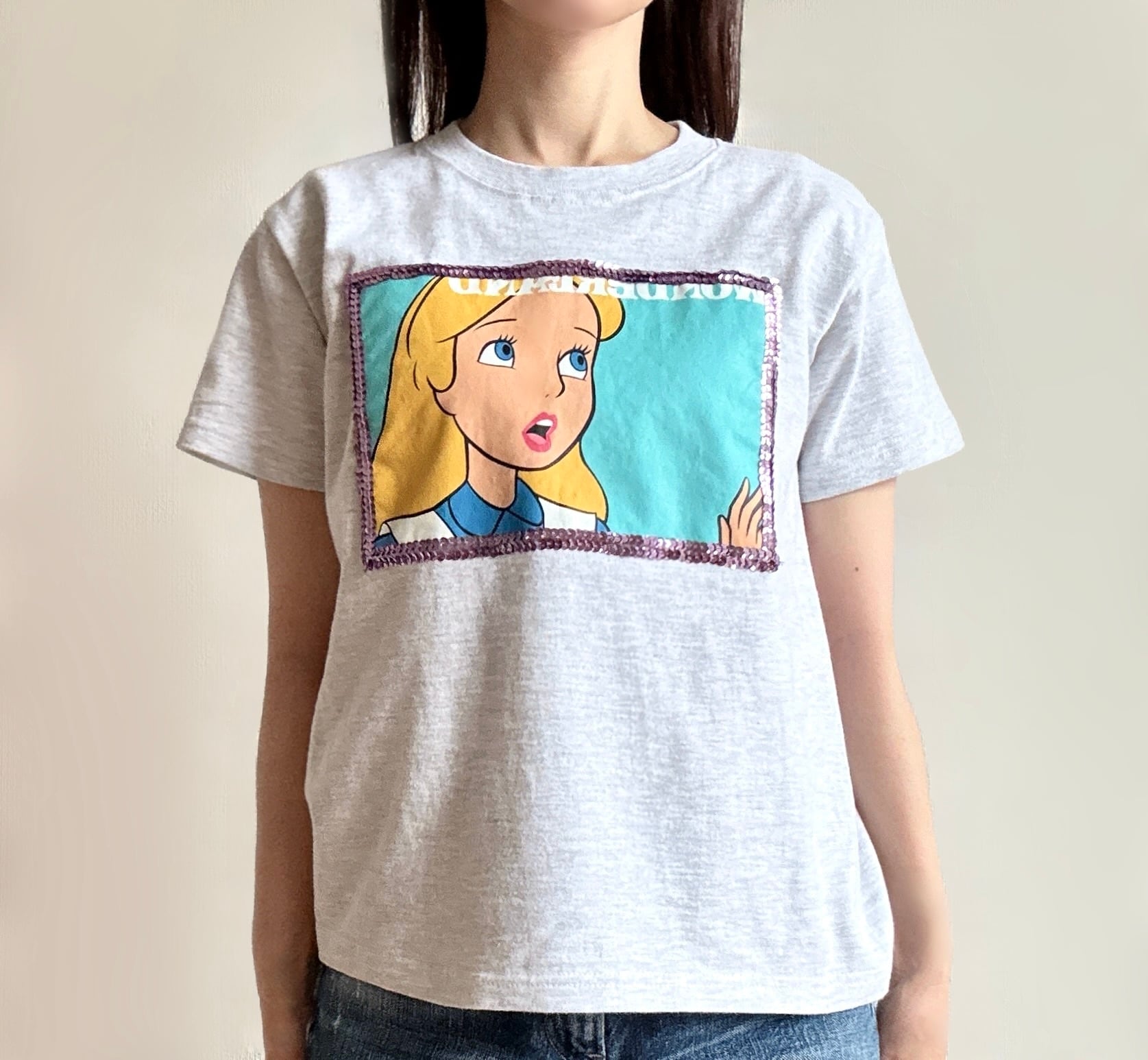 コラボプリント部分をカットし使用したリメイクで、小さめのサイズ感で可愛らしさをより引き立てた一枚です。